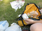 Before leaving, Katharine decided to give calling for the manager one last shot. She found an old but vivacious woman inside. There was no room at the inn because of the festival but the woman, knowing that the campground we were headed to was already full and that we would have to bike in the wee hours of the night to get to the next one, called some of her friends down the road to see if they had room for us. No luck. Then, she said, "Well, I have some empty lawn out back. Why don't you stay there? Actually, I think it's supposed to rain so you can sleep downstairs. I won't even charge you." It's strange that given such helpful generosity, it's hard to know how to react or even to keep your suspicions at bay. She didn't even know our names, we didn't know hers, but she hustled in, telling us to lock our bikes up on the post of the "shop" and leading us downstairs to what we thought would be a leaky basement but was, shockingly, a very nice yoga studio?? She then told us to shower upstairs since one of her guests hadn't yet arrived. Her hospitality was overwhelming and very appreciated in our mile of need.